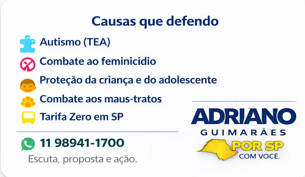 Estou nessa luta por uma São Paulo mais justa e mais humana. Defendo a proteção das nossas crianças, das mulheres, das pessoas com autismo e dos animais. Acredito em políticas públicas que funcionem de verdade: combate à fome, moradia digna, transporte público acessível e tolerância zero à violência. Meu compromisso é ouvir as pessoas, fortalecer quem já faz a diferença POR SP.